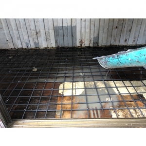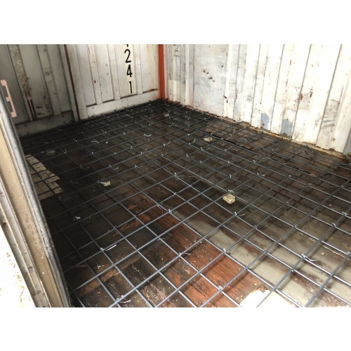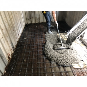 原有貨櫃老舊,地坪木頭破洞。凹陷不平。選用混凝土灌漿工法,簡單耐用。 施工重點: 1. 要綁鋼筋,3#@20*20 2. 因為只灌漿7CM ,選擇4000PSI 全細料(無6分石) 3. 灌漿後,手工整體粉光