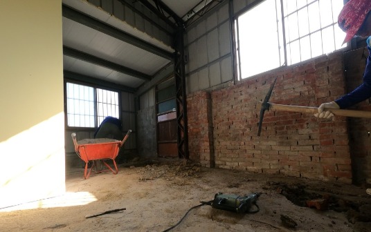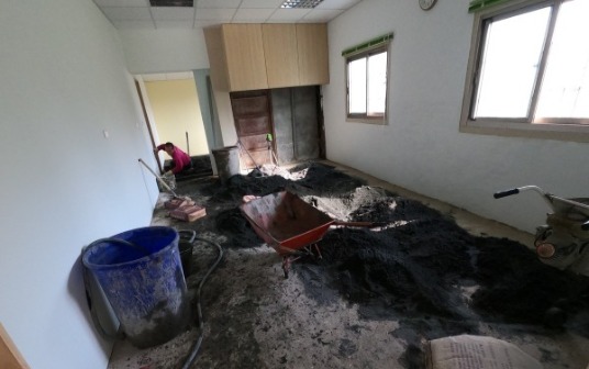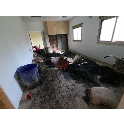 需求目標 :將舊有工廠改為住家,原地坪不平整整平後粉刷貼耐磨石塑地板。
